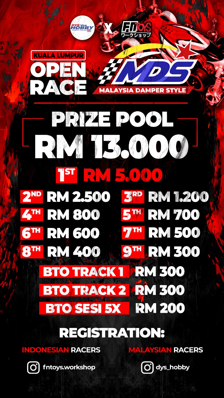 Open Race Damper Style is an exciting Mini4WD racing event co-hosted by FNtoys Indonesia and DYS Hobby Malaysia. Open Race Damper Style is scheduled for 13–14 December 2025 in Kuala Lumpur, Malaysia. This open race brings together Mini4WD enthusiasts from across Southeast Asia to showcase speed and creativity in the Damper Style category. With a total prize pool of RM 13,000, teams will compete for top honors. Mark your calendars – this race adds extra excitement to the 2025 Mini4WD racing calendar!